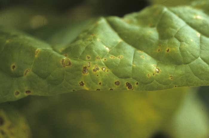 Notons que ces deux bactéries présentent aussi des caractéristiques biologiques similaires et les méthodes de lutte à mettre en oeuvre pour les combattre sont analogues. Leurs symptômes apparaissent souvent sur plusieurs feuilles situées au hasard sur la plante, en pépinière comme au champ. Les plantes affectées par ces 2 bactérioses ont souvent une répartition en foyers dans la parcelle. En France, c'est surtout Pseudomonas syringae pv. tabaci qui a été signalé. A une certaine époque, cette bactérie était endémique dans certaines régions de production et entraînait des dégâts non négligeables, aussi bien en pépinière qu'en plein champ. Cette maladie bactérienne est actuellement assez rare ; nous ne l'avons détectée qu'une seule fois ces dernières années en Isère.