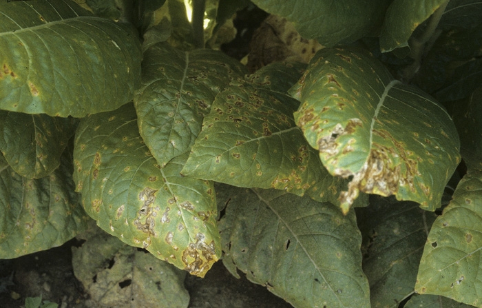 Les deux bactéries Pseudomonas syringae pv. tabaci ("wild fire") et Pseudomonas syringae pv. angulata ("angular leaf spot") (identiques pour certains systématiciens) provoquent, sur les feuilles de tabac, des taches foliaires brunes tout à fait semblables (figures 1 et 2). Ces petites taches, d'aspect humide en début d'évolution (1 à 5 mm), et de forme assez variable (parfois angulaire), prennent une teinte brune à noire en se nécrosant (figure 3). En présence de Pseudomonas syringae pv. tabaci, on observe souvent un halo jaune parfois assez large (figures 4 et 5). Les taches confluent aisément. Les bactéries sont difficilement visibles dans les tissus ; des isolements sur milieu de culture sont nécessaires.