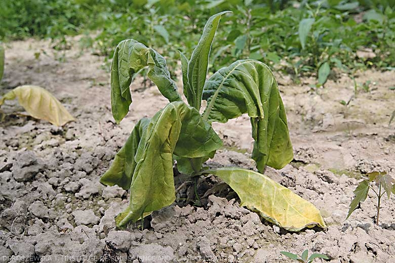 En pépinière, Botrytis cinerea s'attaque surtout aux vieilles feuilles sénescentes qu'il utilise comme bases nutritives et qu'il colonise rapidement (figures 1 et 2) . Par la suite, il gagne la tige sur laquelle il produit des chancres plus ou moins étendus , particulièrement dommageables en pépinière (figures 3 et 4) et au champ, après plantation (figures 5 et 6). Certaines plantes dont la tige est plus ou moins ceinturée au collet (figure 4) finissent par flétrir (figure 7), et/ou des bourgeons axillaires se développent (figure 8)