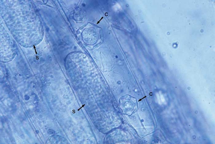 Olpidium brassicae produit des "spores de repos" ou chlamydospores qui assurent sa conservation plusieurs années dans le sol et sur les débris végétaux (figure 1). Il peut aussi se maintenir sur plusieurs hôtes intermédiaires.