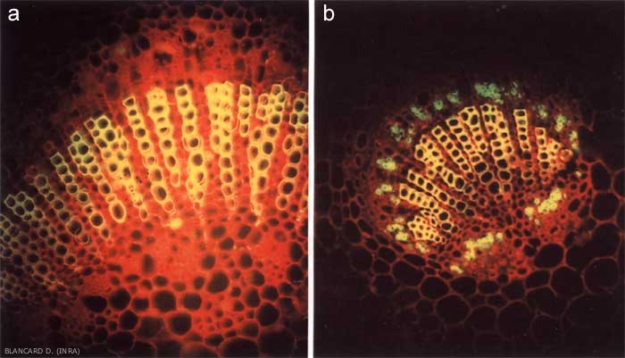 Candidatus Phytoplasma solani est un micro-organisme parasite obligatoire des cellules des tissus conducteurs de la sève élaborée (vaisseaux du phloème). On peut ainsi le détecter en microscopie grâce des anticorps monoclonaux (figure 2).
