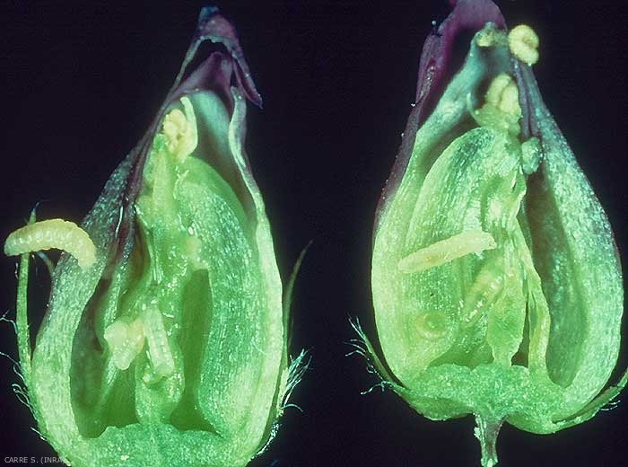 On observe en moyenne 5 larves par fleur (figure 3). Ces larves sont grégaires. La durée de leur développement est variable, de 10 à 24 jours. A la fin de sa croissance, la larve se laisse tomber sur le sol et tisse un cocon dans lequel elle se nymphose 3 à 4 jours plus tard, à moins qu'elle n'hiverne. La durée de développement de la nymphe est au moins d'une dizaine de jours.