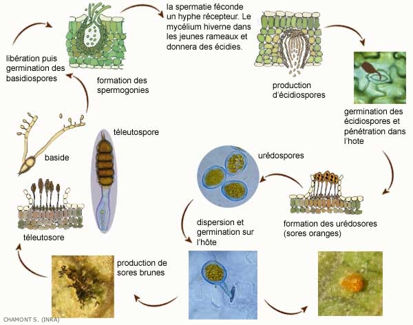 A la suite des premières contaminations printanières, la reproduction et la dissémination du champignon sont assurées par la production d'écidiospores et d'urédospores pendant une grande partie de la période de végétation (figure 2). Les conditions optimales de développement et de production des spores sont des températures modérées (18 à 21° C) d'une part, et une humidité continue pendant deux à quatre heures au niveau de la feuille, d'autre part. En effet, la présence d'eau sous forme liquide, pendant ce laps de temps, est nécessaire pour que les spores puissent germer et pénétrer par l'intermédiaire des stomates dans les tissus de la feuille.