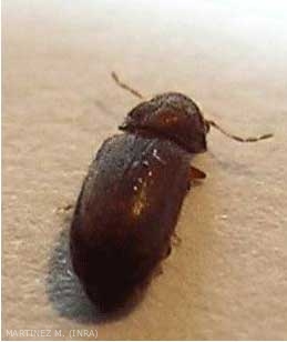 Sur la face dorsale des 6 premiers segments abdominaux on peut voir 2 rangées dorsales de petites épines fines (spinules). Le thorax est élargi sur le côté, ce qui permet de la distinguer d'autres espèces très ressemblantes (par exemple Lasioderma serricorne ou lasioderme du tabac). La tête est protégée et dissimulée sous le pronotum. Les mandibules courtes sont très robustes. La couleur varie du brun jaunâtre ou rougeâtre à marron très foncé.
