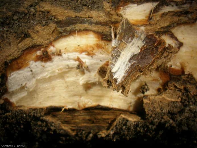 Les hyphes se propagent dans le sol sous la forme de cordons rhizoïdes, d'un diamètre de 7 à 8 µm ; ils s'entourent d'une écorce noire leur conférant l'aspect de racines et rampent à la surface des organes attaqués. Ils sont composés, au centre, de fins filaments incolores et en périphérie des hyphes plus gros et brun ayant par endroit des renflements. Ces filaments bruns se soudent formant l'enveloppe des cordons, puis s'insèrent dans les fissures de l'écorce, s'élargissent en perdant leurs teintes brunes et pénètrent dans les tissus par leurs extrémités.