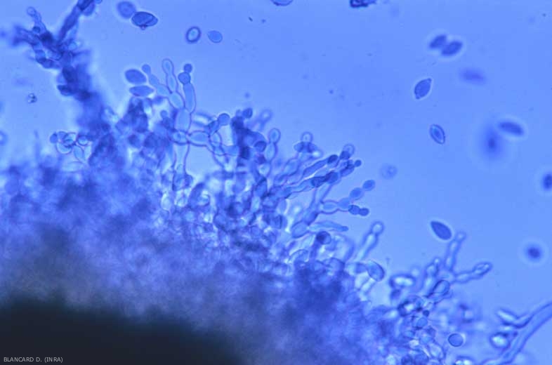Le mycélium des Monilinia est fortement cloisonné, il est cylindrique et a un diamètre important. Il se développe dans les parties pourries des fruits et sous les écorces mortes. Au niveau des craquelures de la cuticule et de l'épiderme du fruit ou du rameau colonisé, le mycélium se rassemble et forme des stromas conidifères (sporodochies) en forme de coussinets hémisphériques fauves pour M. fructigena ou grisâtres pour M. laxa. Les sporodochies de M. fructigena ont un diamètre de 2 à 3 mm alors que celles de M. laxa sont plus petites et plus fragiles. Elles comprennent un ensemble de conidiophores rudimentaires constitués de chaînes d'articles cellulaires qui se séparent et donnent des conidies unicellulaires et hyalines (macroconidies) (figure 1). Ces conidies sont ovoïdes et leur taille peut varier selon la nature du support et les conditions environnementales (en moyenne : 10-13 X 7-14 µm). Elles se séparent les unes des autres par le sommet grâce à la formation de cloisons transversales à un niveau d'étranglement (arthrospores). Ces conidies sont en forme de tonnelet ovoïde chez M. fructigena.