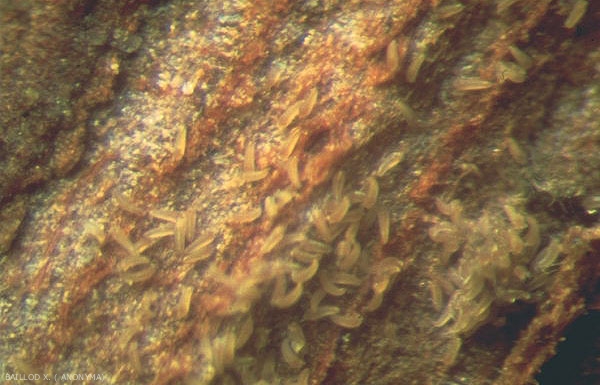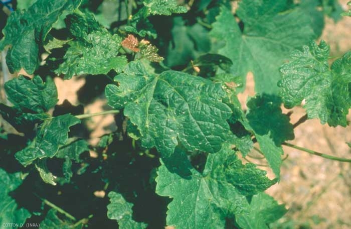 Les femelles d'hiver (deutogynes) restent abritées sous les écailles des bourgeons, dans la zone cotonneuse entre les méristèmes, ainsi que sous l'écorce des ceps et des rameaux (figure 2), généralement près des noeuds. Au débourrement, au printemps, ces femelles se nourrissent aux dépens des tissus des bourgeons et y pondent. Elles y demeurent, avec leur progéniture, jusqu'à ce que la pousse ait entre 8 à 12 feuilles, puis elles migrent à la face inférieure des feuilles où elles vivent et pondent jusqu'à octobre-novembre. Une petite partie des effectifs migre vers les nouveaux jeunes bourgeons.