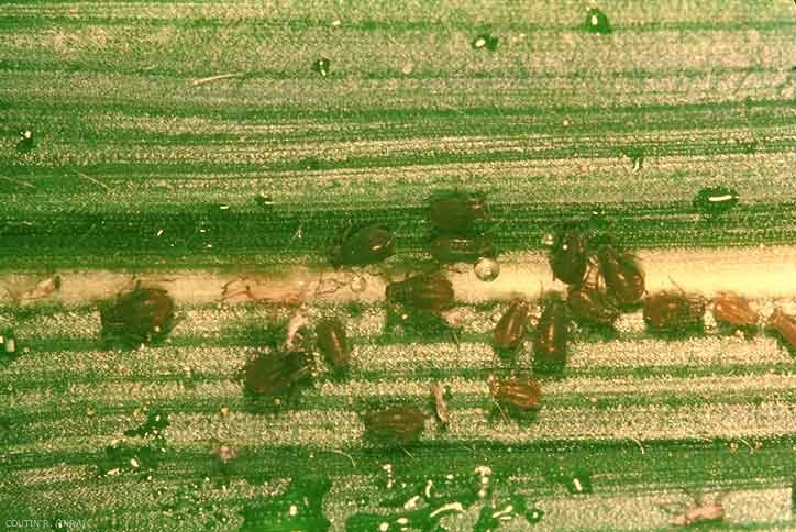 Sous l'effet des piqûres, les feuilles de graminées s'enroulent en spirale. Les céréales de printemps sont les plus affectées.