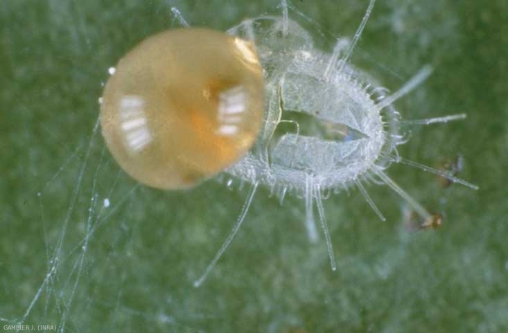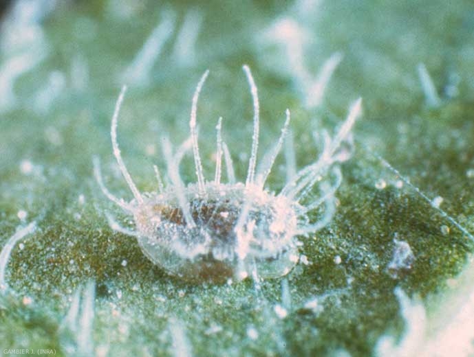 L'oeuf, de forme approximativement conique, est long de 0,25 mm. Il est de couleur blanc jaunâtre lors de la ponte, et gris violacé au bout de 2 jours. Il est porté par un court pédoncule, enfoncé dans les cellules épidermiques. La larve est vert pâle, ovale, plate, et en forme de cochenille. Au 4ème stade, elle mesure 0,8 mm environ (figure 1). Le puparium est blanchâtre, en forme de petite boîte ovale ; il est orné d'excroissances cireuses marginales courtes et porte dorsalement des tubes cireux longs, qui sont quelquefois absents sur certains hôtes (figure 2).