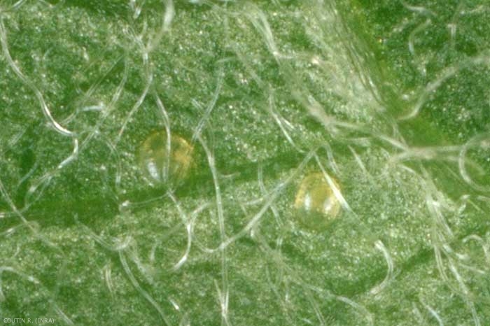 L'oeuf est déposé à la face inférieure des feuilles (figure 1). La larve est minuscule, elle vit à l'intérieur du limbe foliaire et creuse des galeries allongées et sinueuses se terminant par un élargissement pouvant atteindre 3 à 4 mm (figure 2). Les excréments déposés à l'intérieur de la mine forment un mince filet noir. La chenille en fin de croissance quitte la feuille, se nymphose dans le sol et hiverne (figure 3).
