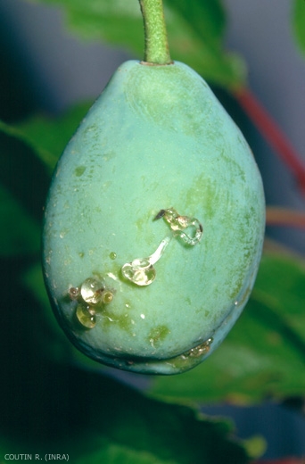 Les dégâts des chenilles de 1ère génération passent souvent inaperçus, la chute des fruits étant confondue avec la chute physiologique (fruits non fécondés par exemple). Les chenilles de la 2ème génération occasionnent des pertes importantes pour les variétés semi-tardives et tardives : le fruit attaqué prend une coloration foncée, ne se développe plus et laisse exsuder quelques gouttelettes gommeuses caractéristiques par l'orifice de pénétration de la chenille (figure 2) ; il tombe prématurément. Les variétés précoces de prunier sont faiblement attaquées.