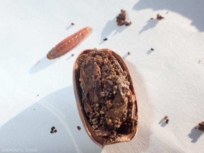 A la fin de son développement (de la fin septembre à la mi-novembre avec un maximum vers le 10 octobre), la chenille abandonne le fruit en faisant un trou de 2 à 3 mm de diamètre et se confectionne dans la terre une coque soyeuse dans laquelle elle hiverne. Dans le sud de la France, elle se nymphose en juillet.