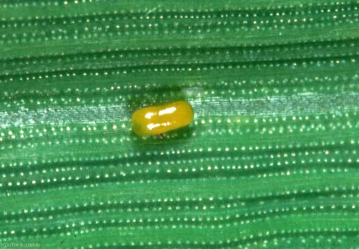La larve se nymphose dans une coque blanche sur les feuilles, les tiges et les épis (figure 2). La nymphose dure environ 2 semaines (fin juillet). Des températures inférieures à 16 ou 17°C en mai-juin et des précipitations importantes provoquent une mortalité élevée des larves et des nymphes.
