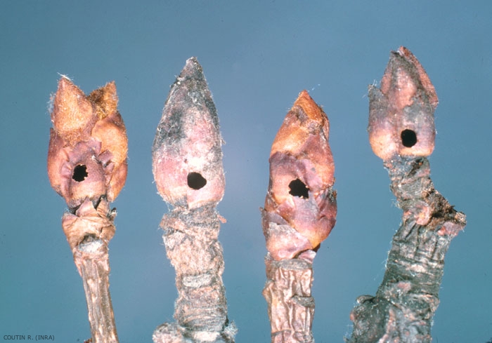 En automne, les piqûres nutriciales de l'adulte à la base des bourgeons foliaires peuvent atteindre les faisceaux libéro-ligneux et provoquer le dessèchement partiel ou global du bourgeon. Les bourgeons floraux attaqués par les larves ne s'ouvrent pas du tout ou parfois se dégagent irrégulièrement et se dessèchent avant, ou au moment de la pleine floraison (figure 2).
