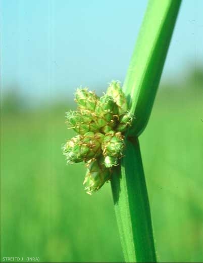 Inflorescence : 3 à 8 épis fasciculés rétrécis, sessiles, roussâtres, de forme ovoïde ou lancéolée, de 5-10 mm, réunis en seul glomérule ; 3 stigmates, bractée florale mucronée ;