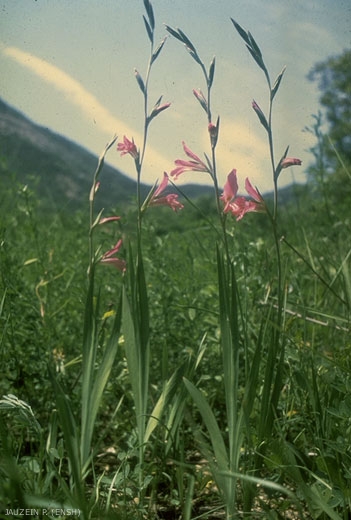 Fleurs pourpres ou roses au nombre de 5 à 10, disposées en grappe lâche. Chaque fleur est munie de 2 bractées inégales, de 6 divisions dressées inégales et presque disposées en 2 lèvres soudées en tube court à la base. Anthères plus longues que les filets. Stigmates étroits, régulièrement rétrécis jusqu'à la base