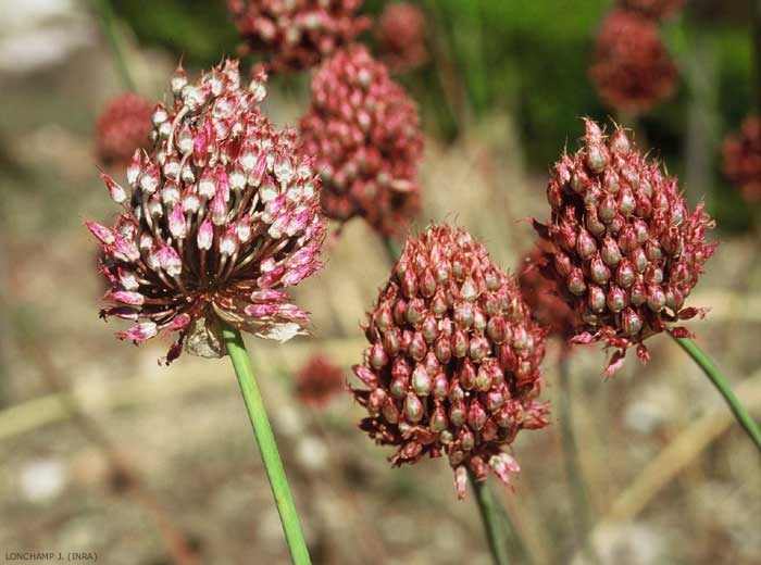 Tige cylindrique, dressée, pleine, feuillée jusqu'au milieu. Bulbes entourés de bulbilles