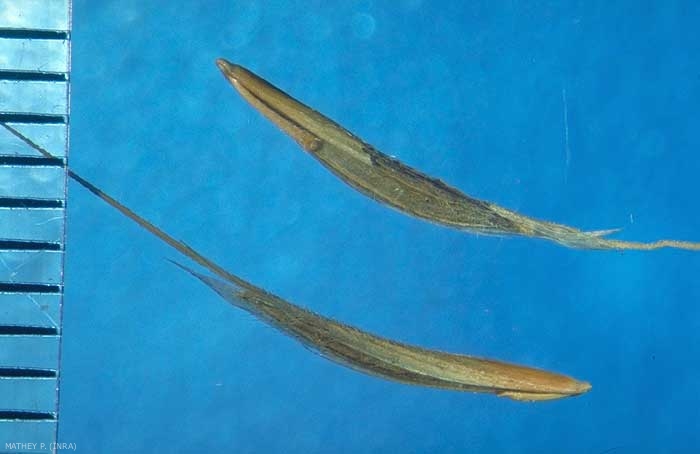 Semence généralement dispersée avec 1 fleur entourée des glumelles. Présence d'une baguette à la base de la glumelle inférieure (lemme), baguette de 2 mm