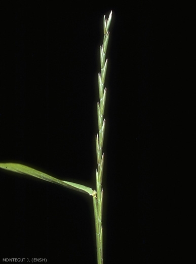 Inflorescence : épi grêle, raide et dressé ou un peu courbé dans le haut, formé d'épillets lancéolés, un peu écartés de l'axe de l'épi pendant la floraison. Chaque épillet contenant de 3 à 9 fleurs dont les glumelles inférieures longues de 6 à 8 mm sont dépourvues d'arête. Glume un peu plus courte que l'ensemble des glumelles ;