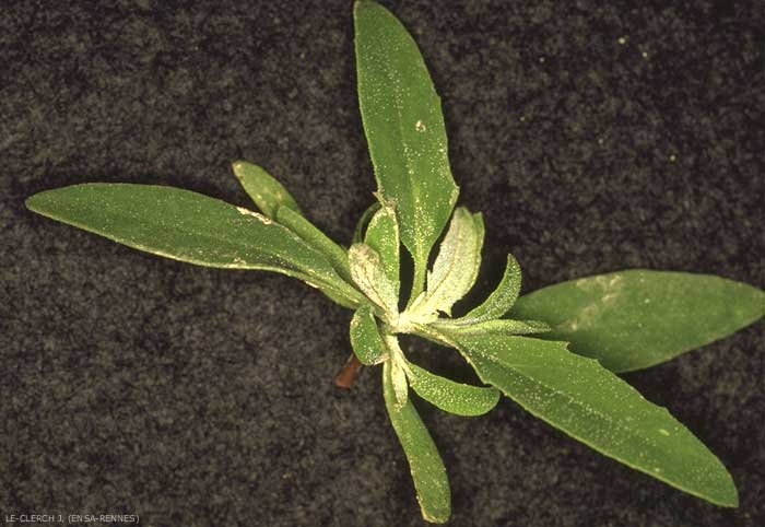 Feuilles farineuses au stade jeune, généralement glauques, plus tard vertes sur les 2 faces, losangiques, lancéolées, amenuisées à la base. Base des feuilles inférieures avec 2 dents. Développement précoce des bourgeons cotylédonnaires
