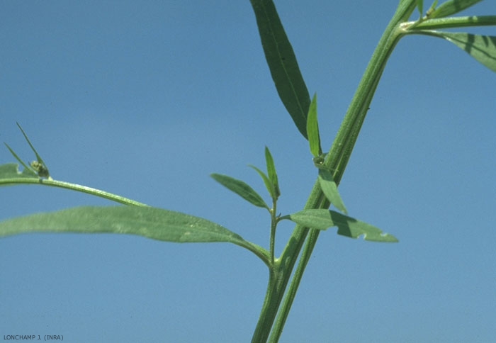 Feuilles simples, ovales à triangulaires, irrégulièrement dentées.