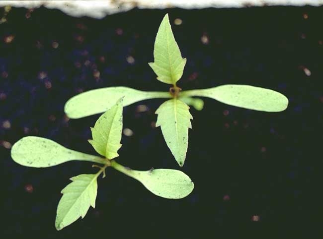 Feuilles : les 2 premières opposées, lancéolées et dentées avec 2 lobes à la base ; limbe glabre à nervation pennée. Présence d'une touffe de poils à l'insertion du pétiole sur la tige.
