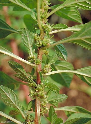 Fleurs verdâtres en glomérules tous axillaires, feuillés et souvent rapprochés au sommet, bractées de même longueur que les 2 ou 3 sépales ovales, lancéolés, aigüs, bordés de blanc pour chaque fleur