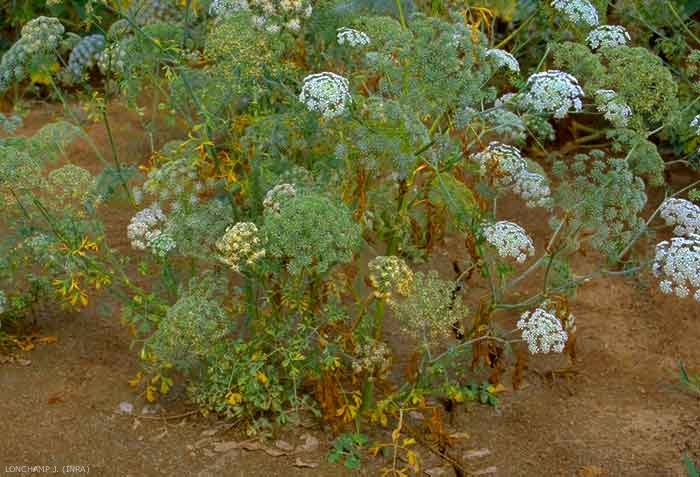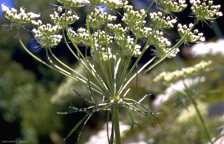 Fleurs blanches réunies en ombelles de 20 à 30 rayons avec des pétales échancrés. Involucre à nombreuses bractées divisées, chacune en 3 à 5 lanières très étroites et très allongées, se rétrécissant jusqu'à leur sommet
