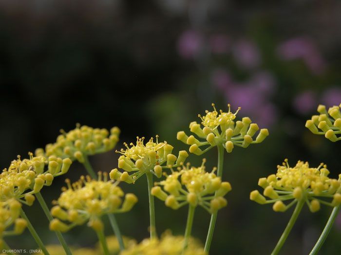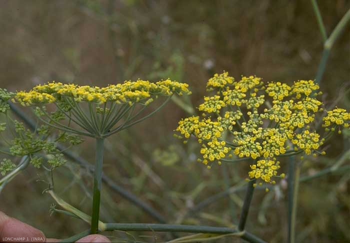 Fleurs jaunes, petites d'environ 1 mm. Ombelles grandes (15 cm de diamètre), 4 à 25 rayons. Involucre et involucelle nuls
