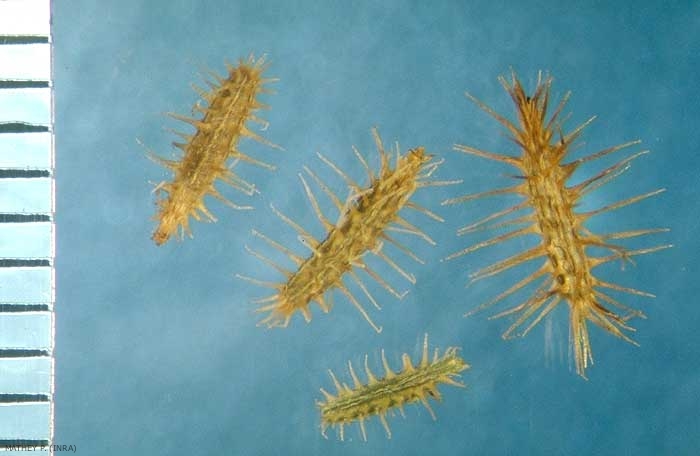 Ornementation : à côtes primaires munies de pointes courtes en alêne dès la base (bifurquées en V), à côtes secondaires portant de 2 à 3 rangs d'aiguillons grêles, droits, très rudes, très fins de 1,5 à 2 mm ;