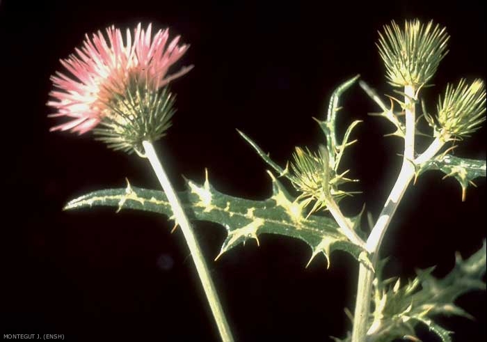 Feuilles vertes irrégulièrement tachées de blanc sur la face supérieure, un peu velues au-dessus et blanches tomenteuses (cotonneuses) en-dessous. Feuilles étroites lancéolées, pennatipartites à divisions lancéolées aiguës et épineuses