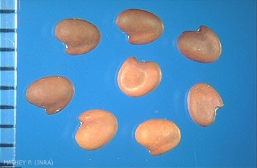 Forme : réniforme due à une forme générale ellipsoïde déformée en coeur par la hernie racinaire atteignant les 2/3 de la graine et du V micropylaire visible ;