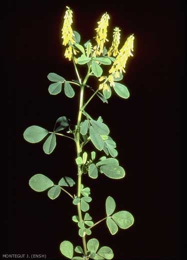 Première feuille en losange large, à base obtuse ; les suivantes divisées, tripartites.