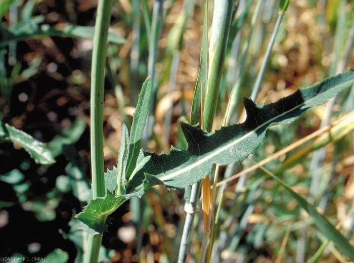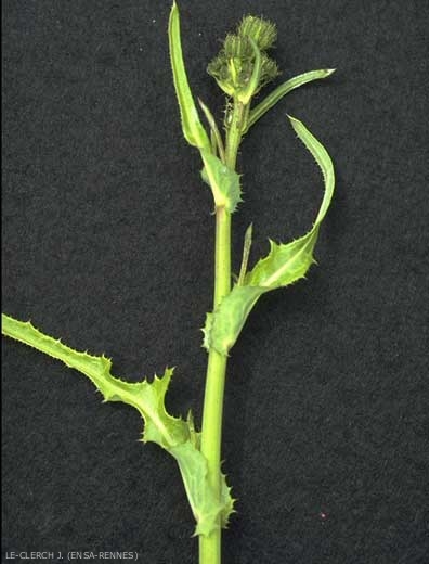 Feuilles inférieures disposées en rosette. Feuilles échancrées lobées, dents dirigées vers la base, épineuses mais non piquantes, glabres, pennatipartites ou pennatifides, à segments peu nombreux, espacés. Feuilles caulinaires embrassantes, à oreillettes courtes, arrondies ;