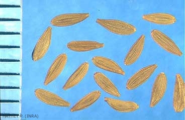 Forme : fusoïde aplani en 2 faces planes. Aigrette sessile à soies lisses, blanches