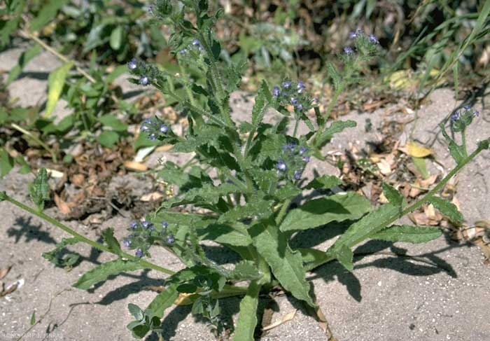 Fleurs petites à corolle bleu-clair, aplatie en roue, à tube court. Sépales à soies raides. Inflorescence en 2 cymes scorpioïdes denses terminales