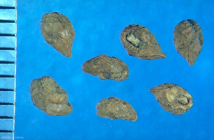 Forme : ovoïde dissymétrique, légèrement arquée. Base aplanie convexe, extrémité apicale diédrique. Zone hilaire protubérante à 90° par rapport à l'axe de la semence, soulignée par un bourrelet en ourlet