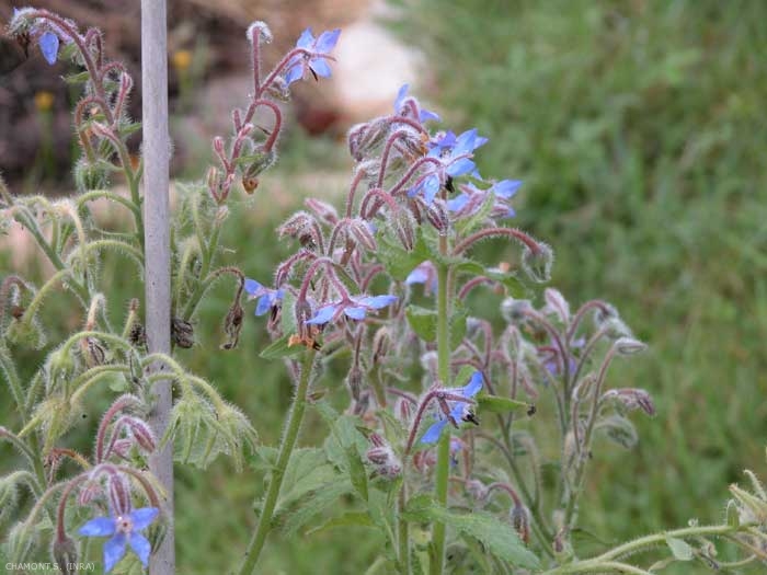 Fleurs bleues (figure 3), corolle étalée en roue à 5 lobes. Inflorescence ramifiée en cymes scorpioïdes