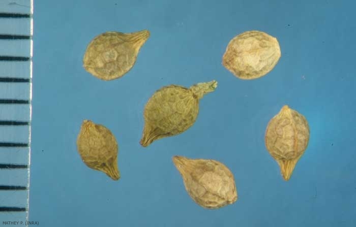 Forme : globuleuse, ovoïde allongée (bec apical)