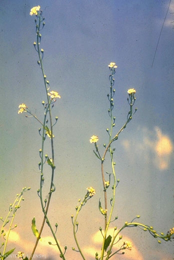 Fruits : silicules ovoïdes, globuleuses, ridées, portées par des pédoncules courbés vers le haut. Grappe fructifère allongée et étroites.
