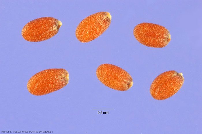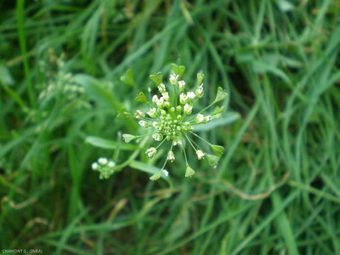 Fruit contenant les graines : silicule triangulaire de moins de 6-7 mm, légèrement en coeur à l'extrémité, bords latéraux rectilignes ou convexes.
