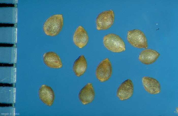 Forme : semence ovoïde, aplanie et apiculée, diédrique sur sa face ventrale, convexe sur sa face dorsale