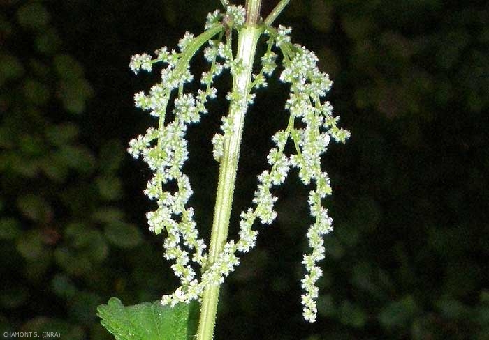 Fleurs verdâtres mâles et femelles en grappes pendantes sur des pieds différents (plante dioïque), plus longues que le pétiole ; périanthe pubescent