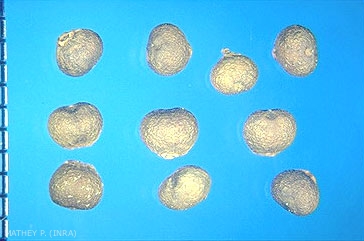 Forme : semence globuleuse, plus large que haute, à sommet arrondi-échancré. Hile large en fossette symétrique à bord ourlé, réformant la silhouette générale globuleuse souvent creusée de 2 petites dépressions vers le haut