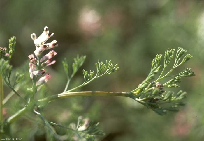 Feuilles inférieures disposées en rosette ; feuilles d'emblée divisées en 3 segments pétiolés, à leur tour découpés en 3 à 4 lanières étroites, une seule nervure discrètement visible à la face inférieure. Feuille alternes, vert-bleuté, 1 à 4 fois pennatipartite avec segments atteignant parfois 3 mm de largeur et le plus souvent pointus
