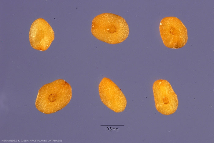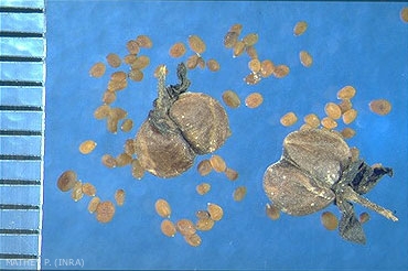 Forme : semence aplanie "en bouclier ", pas de marge enroulée, face supérieure munie d'une crête, face inférieure creusée au niveau du hile ;