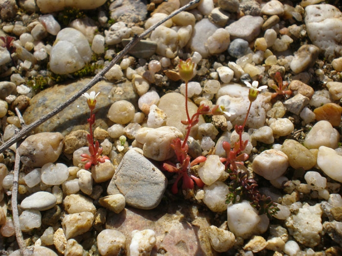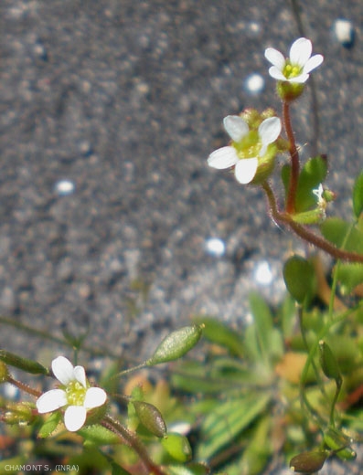 Fleurs blanches de 4 à 8 mm de long en cymes dichotomes irrégulières, à pédicelles filiformes la plupart 3 à 5 fois plus longs que le calice adhérent à l'ovaire et couvert de poils visqueux. Sépales dressés elliptiques obtus, plus courts que les pétales ;