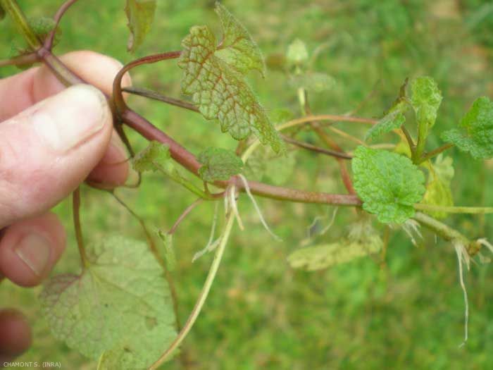 Feuilles opposées arrondies à cordées, longuement pétiolées, crénelées. Nervures très nombreuses, réunies entre elles en réseau, donnant au limbe un aspect très gaufré. Feuilles supérieures à pétiole court et souvent teintées de rouge près de l'inflorescence, rapprochées en pyramide ;