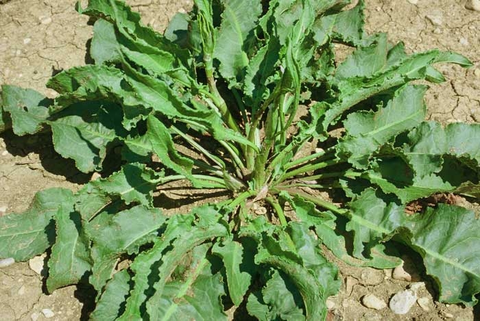 Feuilles inférieures disposées en rosette, de teinte vert-foncé. Feuilles à limbe ondulé, plus ou moins crispées sur les bords ; les inférieures à limbe ovale-allongé, aigu, atténué ou tronqué à la base. Feuilles à long pétiole canaliculé, souvent doublement enroulées en cigare sur leur face inférieure, à l'intérieur d'une gaine membraneuse et blanchâtre (ochréa) ;