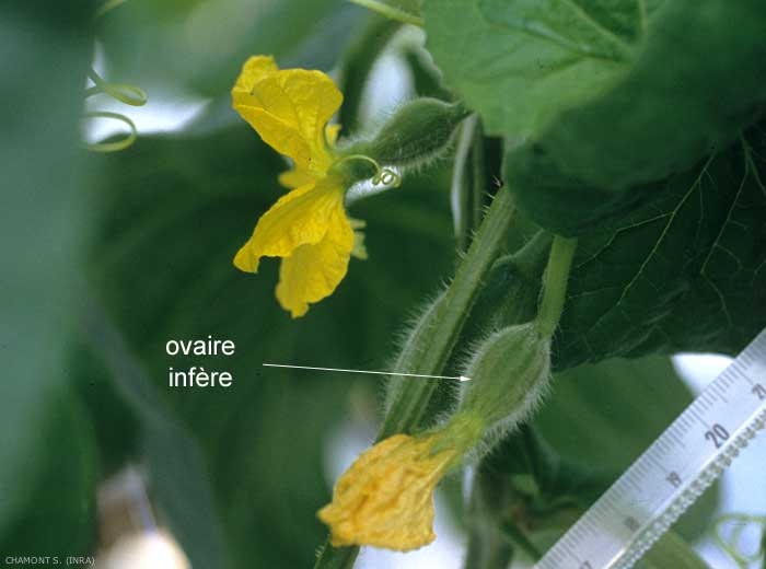- infère : caractéristique de l'ovaire placé sous le calice et les autres pièces florales, par exemple chez les Cucurbitaceae (figure 5).